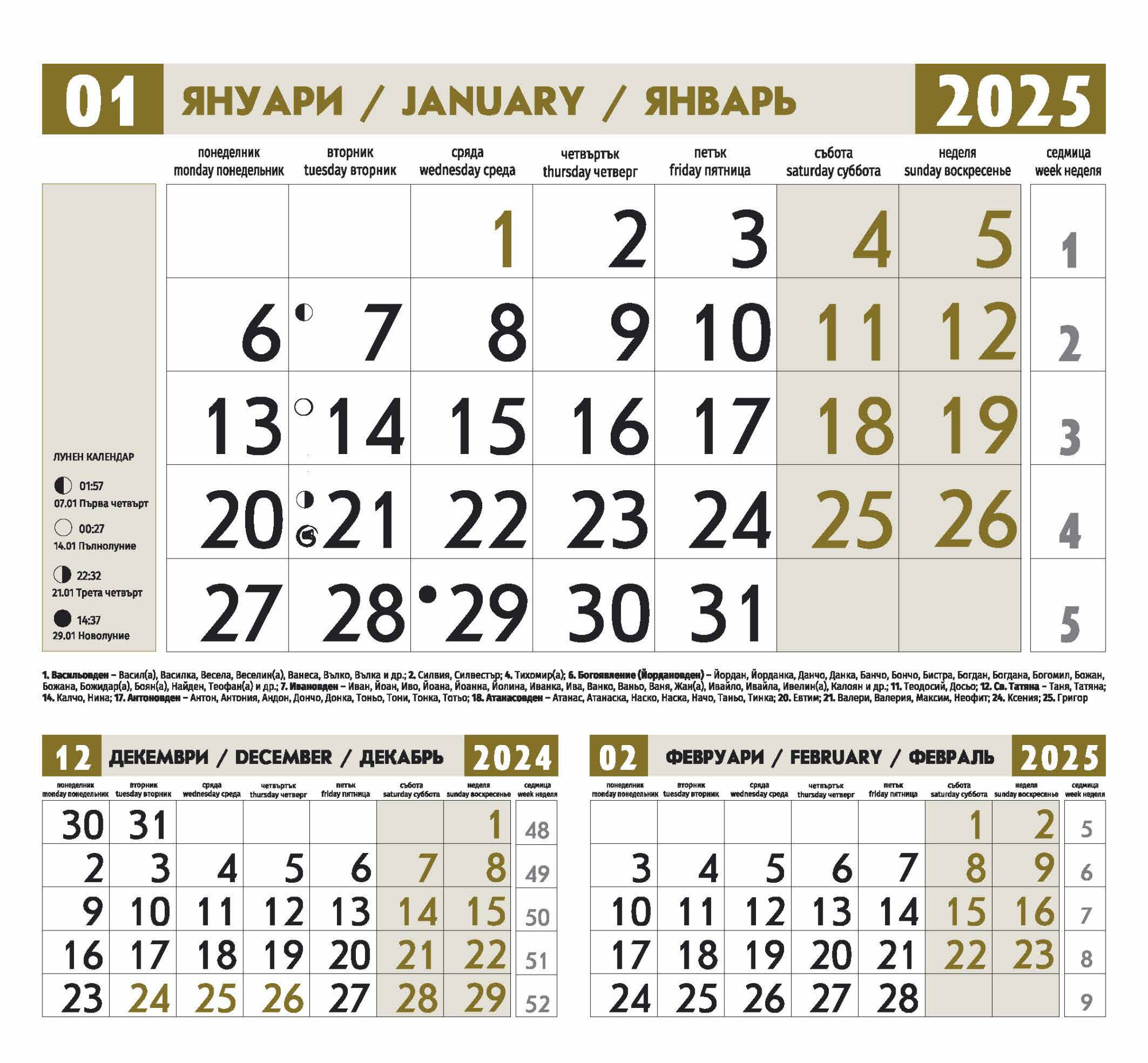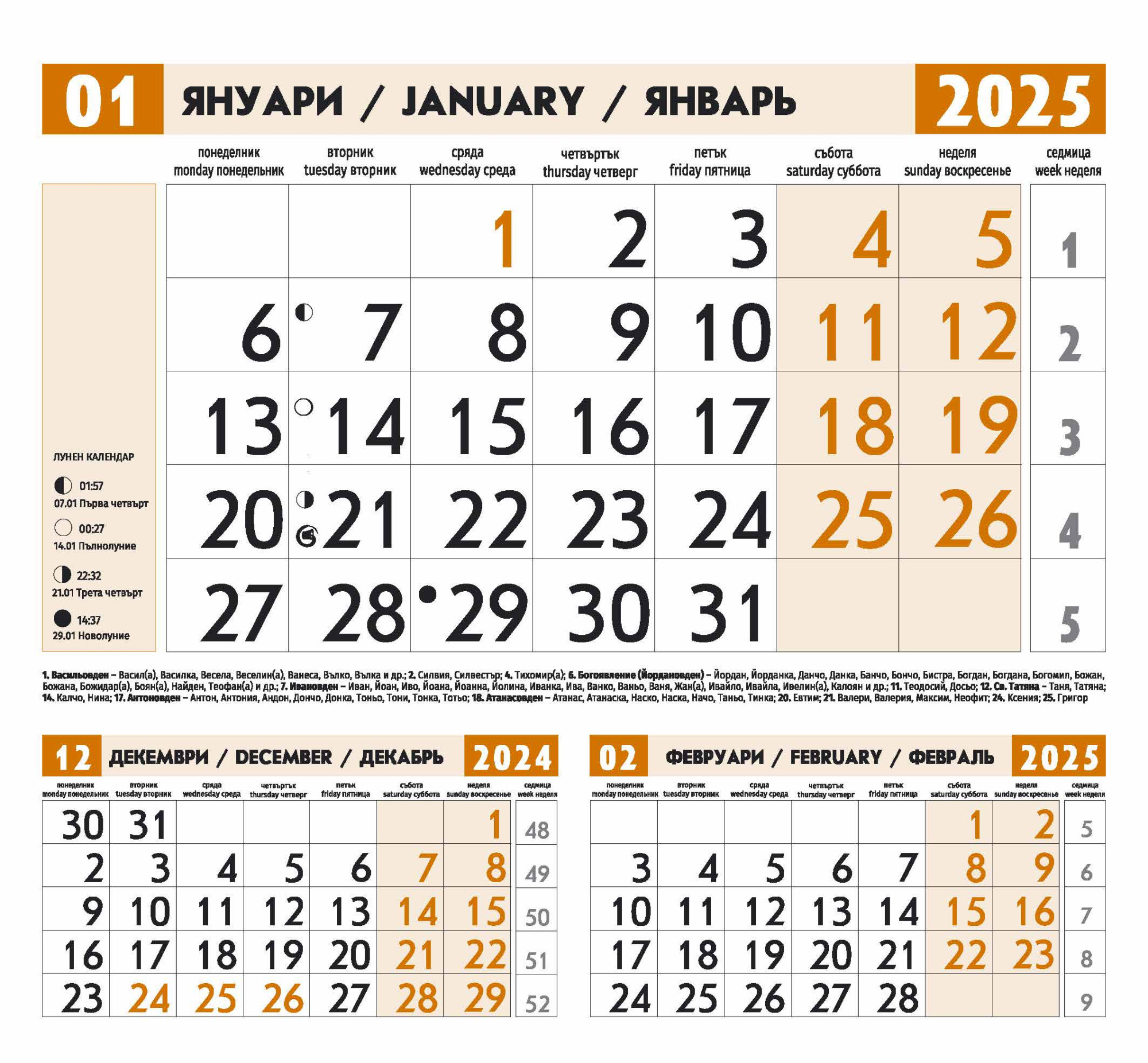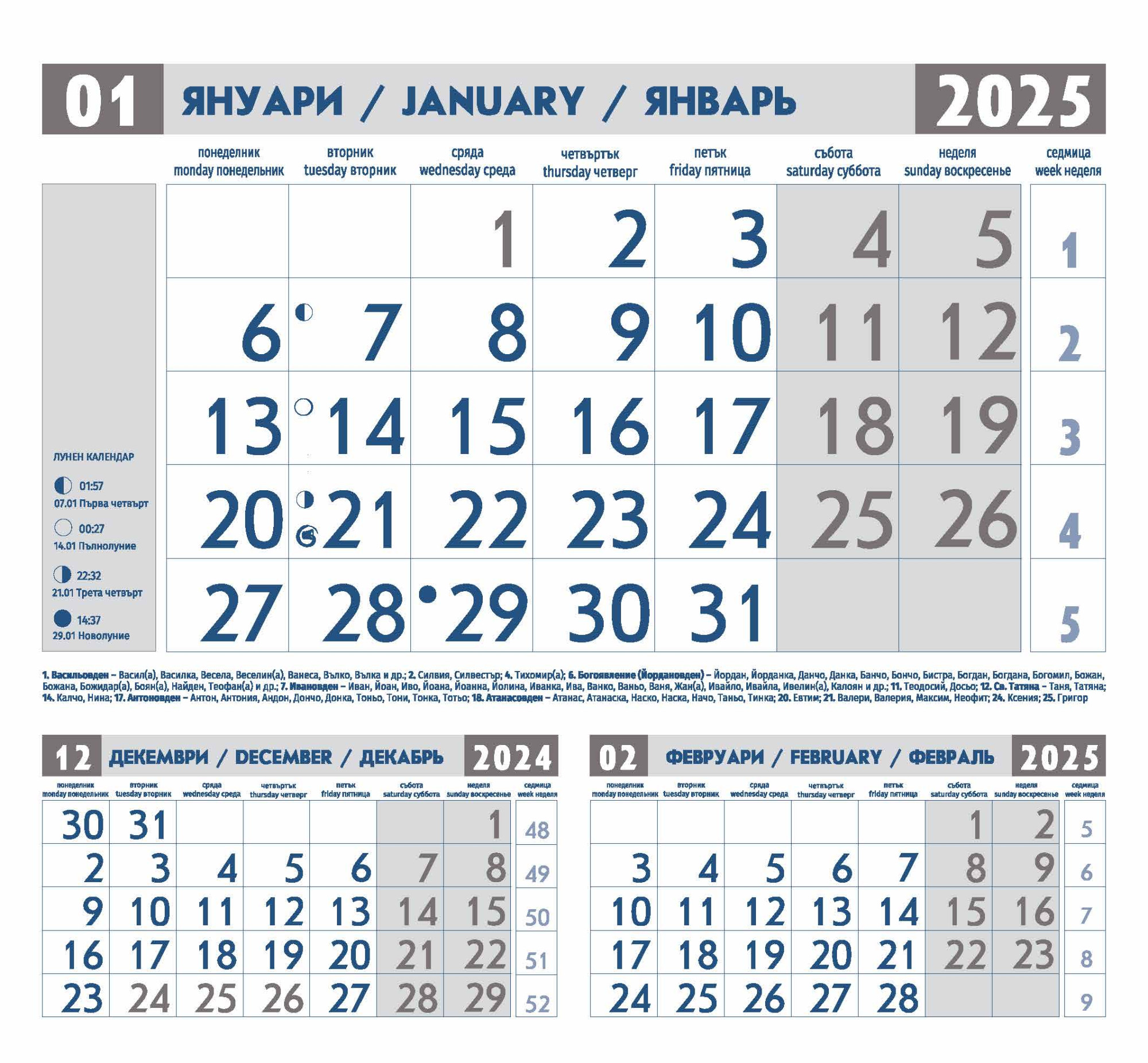 Съдържа следната информация: официални, национални и църковни празници, именни дни, зодиакални знаци, лунни фази.