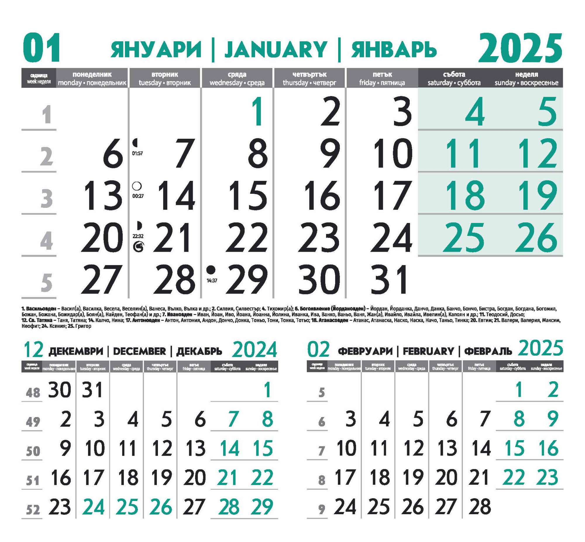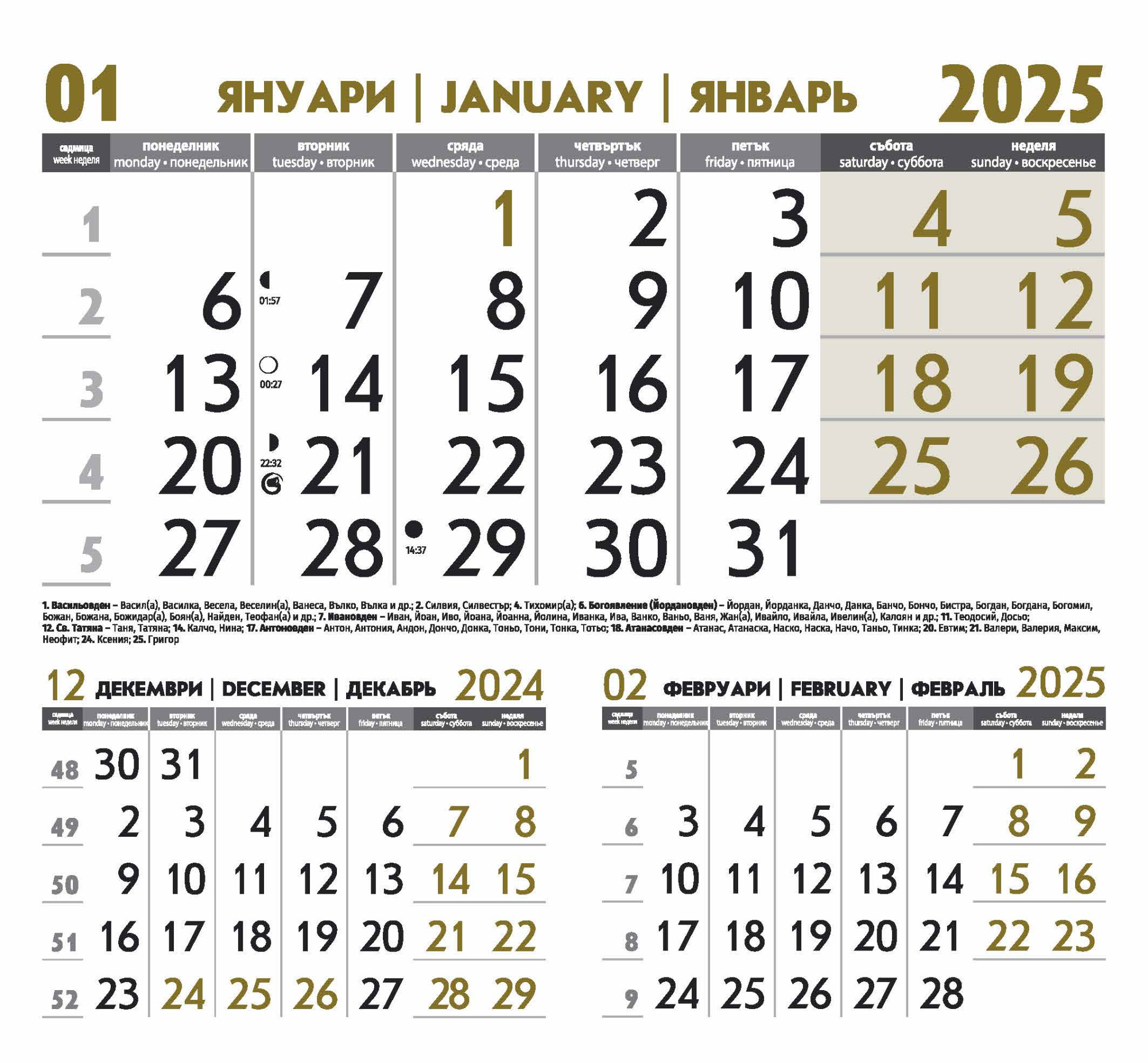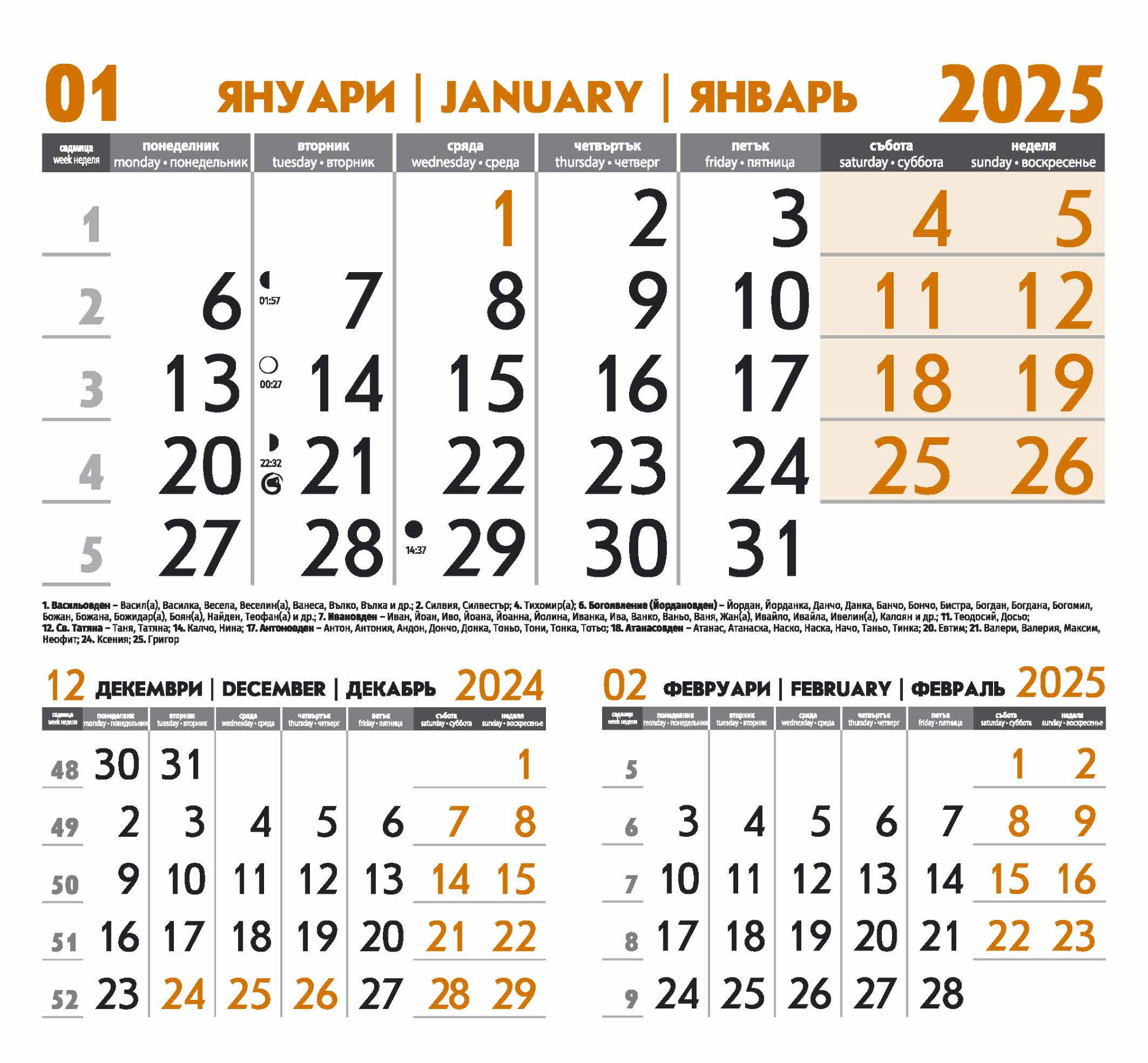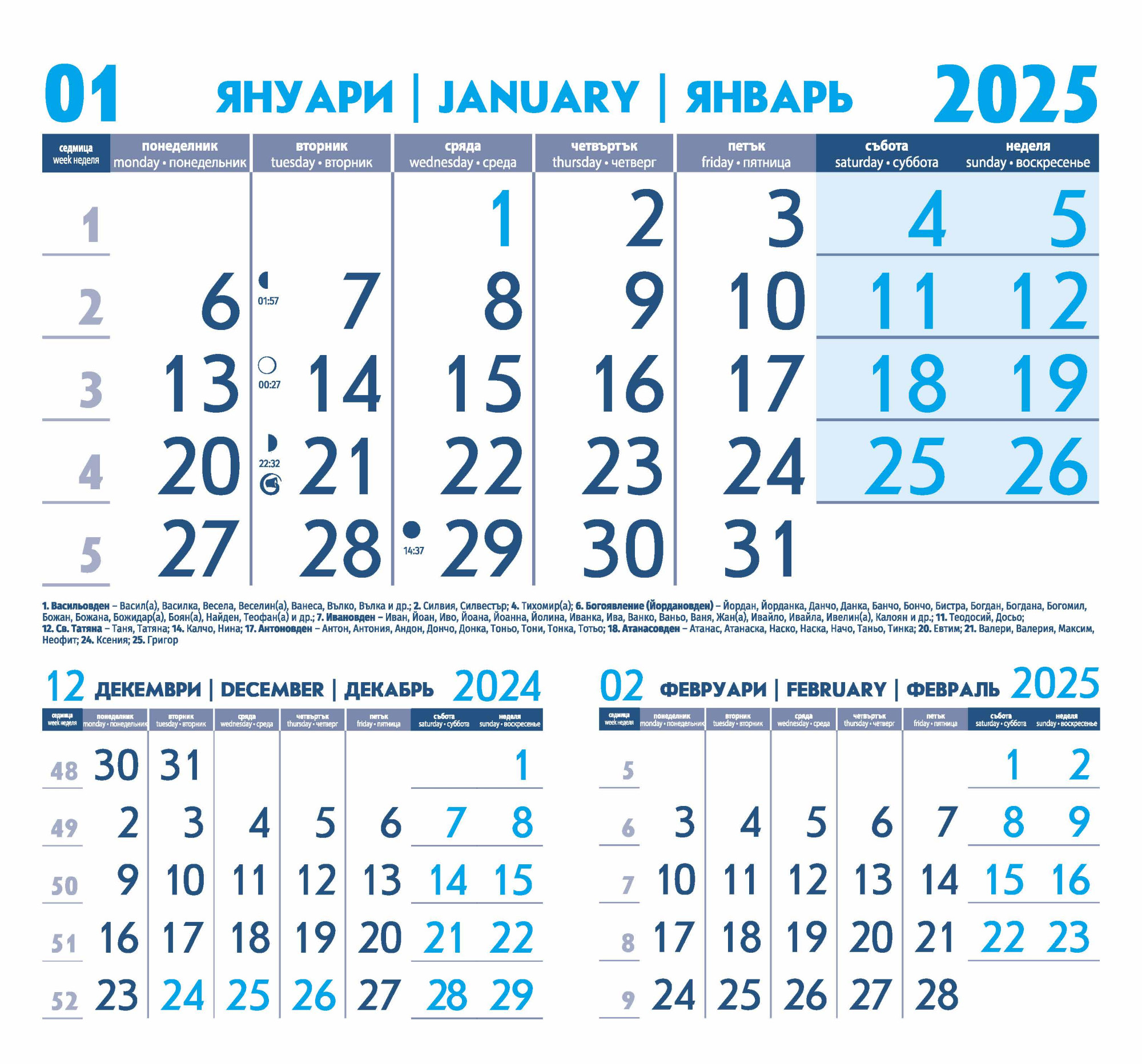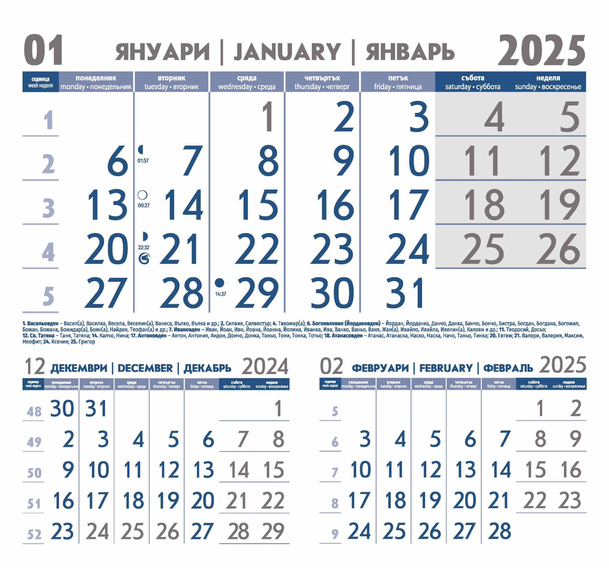 официални, национални и църковни празници, именни дни, зодиакални знаци, лунни фази