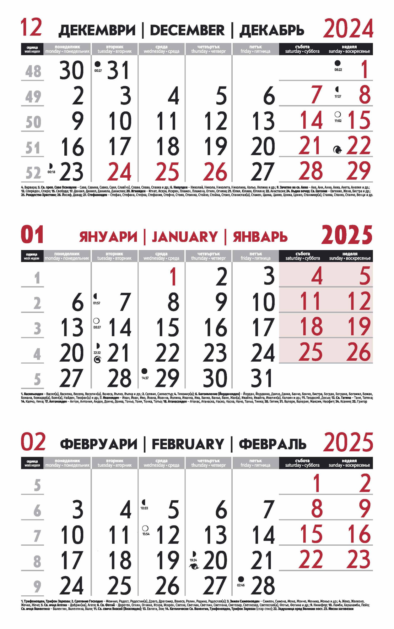 официални, национални и църковни празници, именни дни, зодиакални знаци, лунни фази